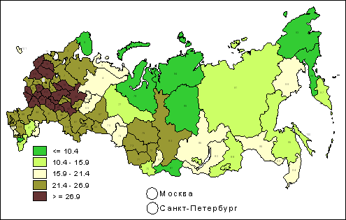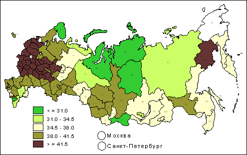 Рисунок 17. Доля женщин репродуктивного возраста (15-49 лет) в сельском женском населении России (%) Население России в целом ожидает трудное демографическое будущее, но особенно остро это ощутит ее сельское население. Несмотря на существенно более высокий, по сравнению с городским населением, уровень рождаемости, демографические перспективы сельского населения гораздо хуже, потому что даже при небольшом, по сравнению с недавним прошлым, оттоке в города сельское население потеряет значительную часть молодого населения, что фактически означает потерю им своего демографического будущего. Компенсировать данные потери за счет внешней миграции невозможно. Развитие ситуации в этом ключе практически предопределено для большинства регионов Северо-запада, Центра и Поволжья.