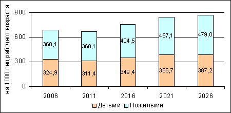 В связи со старением населения, а также колебаниями его возрастного состава, обусловленными особенностями российской возрастной пирамиды, изменения демографической нагрузки на трудоспособное население будут иметь волнообразный характер (рис. 14, табл. 11). К 2011 году общая нагрузка снизится, и снижение это будет связано с уменьшением нагрузки детьми. Далее численность лиц рабочих возрастов будет снижаться, и это приведет к росту общей нагрузки в следующем десятилетии. При этом более значительно будет расти нагрузка пожилыми людьми. Поскольку прогноз предусматривает рост рождаемости, хотя и не очень значительный, то и нагрузка детьми во второй части прогнозного периода будет увеличиваться (рис. 15).