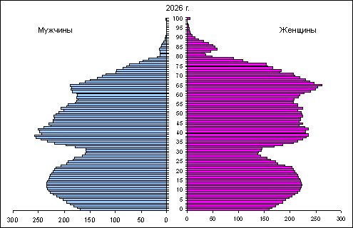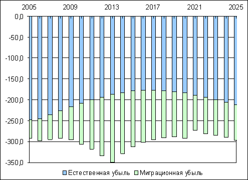 Средний вариант прогноза считается наиболее вероятным, но, вообще говоря, ситуация может быть еще острее, если, например, рождаемость не будет увеличиваться, или миграция молодежи из села превысит ожидаемые объемы. Кроме того, убыль населения не проходит бесследно, с каждым годом депопуляции возрастная структура населения набирает и набирает инерцию убыли, разгоняющую еще более процесс депопуляции.