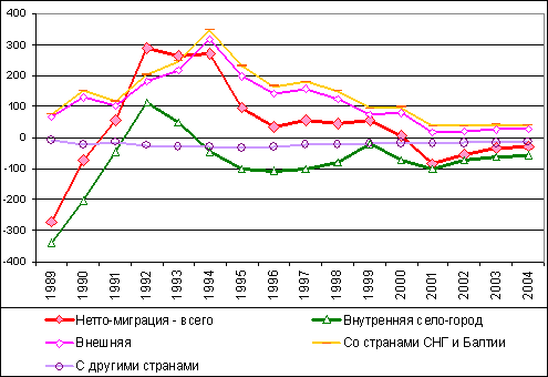 На протяжении длительного времени — особенно, начиная с конца 1930-х годов, — продолжалась массовая миграция сельского населения России в города. В конце 1980-х — начале 1990-х долговременная тенденция оттока сельского населения в города нарушилась, не только произошло резкое сокращение притока населения в города, но и наблюдалось попятное движение горожан в село, что обусловило инверсию миграционных трендов города и села (рис. 6).