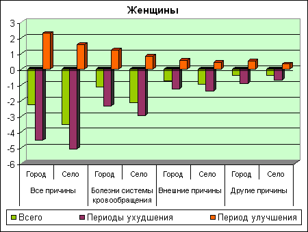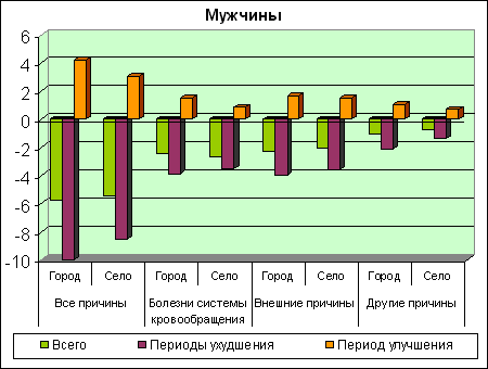 Таблица 5. Вклад отдельных причин смерти в изменение ожидаемой продолжительности жизни сельского населения в возрасте 15 лет, в годах| Период | Продолжит. жизни | Изме- нение в тече ние дан ного пери- ода | в том числе за счет смертности от следующих причин (лет) | |||||||