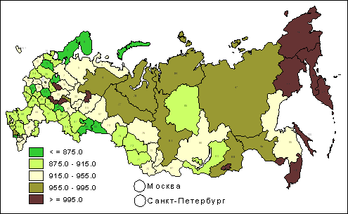 Рисунок 15. Демографическая нагрузка в сельском населении России (на 1000 лиц рабочего возраста), 2026 год В предстоящие двадцать лет в сельском населении в целом по России соотношение мужчин и женщин немного улучшится (табл. 12), особенно заметно — в Центральном федеральном округе, что будет, скорее всего, следствием более интенсивной миграции в этот регион. В то же время, в Северо-Западном, Уральском, Сибирском федеральных округах ожидается снижение данного показателя. К концу прогнозного периода сохранятся существенные различия в соотношении мужчин и женщин по отдельным регионам (рис. 16).