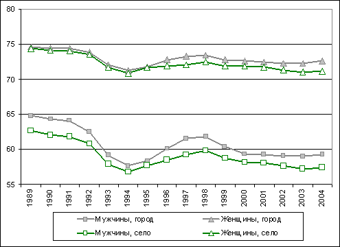 Рисунок 3. Ожидаемая продолжительность жизни городского и сельского населения России, 1989-2004, лет Начиная с 1999 года, после короткого периода роста между 1994 и 1998 годами, продолжительность жизни в России снова снижается. При этом потери в продолжительности жизни мужчин в городах (0,09 и 0,02 года у мужчин и женщин, соответственно) были гораздо меньше, чем у жителей сельских местностей, где продолжительность жизни мужчин сократилась на 0,38 года, а женщин — на 0,29 года.