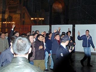 Группа из 40 турецких националистов-членов крайне правой Партии великого единства, связанной с террористической организацией "Серые волки", сегодня попыталась ворваться в историческое здание храма Святой Софии в Стамбуле в знак протеста против визита Папы Римского Бенедикта XVI в Турцию. Об этом, как передает ИТАР-ТАСС, сообщают итальянские СМИ со ссылкой на турецкие органы правопорядка. Все нападавшие были арестованы полицией у входа в бывший православный собор, где сегодня время располагается музей.