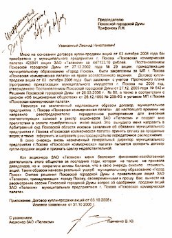 Александр Копылов сообщил в ответ, что городская Дума обратилась в прокуратуру по поводу неисполнения принятых ею решений о приватизации имущества администрацией Пскова. «Прокуратура ответила, что акции «Телекома» были переданы в хозяйственное ведение Псковской коммерческой палате в 2002 году, поэтому она имеет полное право исполнять все права акционера ЗАО «Телеком» – в том числе право реализации акций самостоятельно», - рассказал Александр Михайлович. Письмо из прокуратуры, по его информации, было получено 27 сентября. А 3 октября коммерческая палата продала эти акции гражданину Панченко.