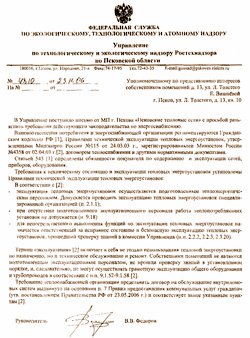 Сейчас в стадии разрешения находится вопрос предоставления нашей организации собственниками помещений в доме № 13 по улице Л.Толстого лица, обслуживающего внутридомовые инженерные сети, в частности, сети отопления и горячего водоснабжения вместе с тепловым узлом. Наше требование состоит в том, что, не имея специального теплотехнического образования данное лицо должно пройти обучение в Ростехнадзоре. И опять г-жа Е. Вишнева считает, что требования нашей организации неправомочны. 27.11.2006 года пришел ответ из Управления по технологическому и экологическому надзору Ростехнадзора по Псковской области, подтверждающий нашу правоту. Данный документ прилагаю к своему ответу полностью.