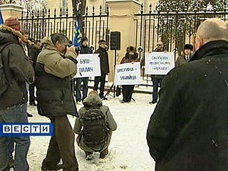 Активисты ЛДПР во главе со своим лидером Владимиром Жириновским пришли к зданию дипмиссии на Погодинской улице около 12:00 мск.