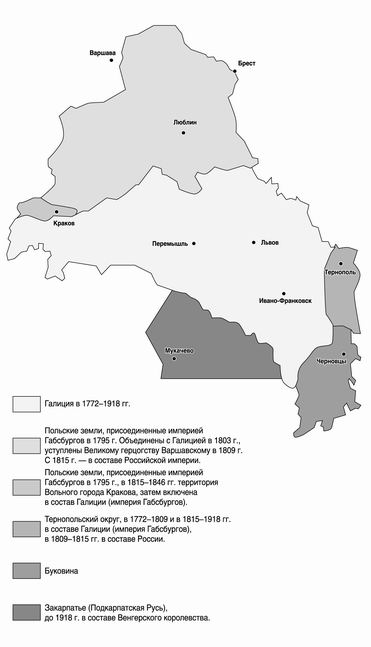 Галиция отошла к Габсбургам в результате первого (1772) и третьего (1795) разделов Речи Посполитой (во втором разделе Австрия не участвовала)[1]. Буковина в 1774 году была отвоевана Австрией у османской Турции и присоединена к Галиции; в отдельную провинцию она была выделена в середине XIX века. Характерно, что Мария Терезия, в царствование которой произошел первый раздел, выступала против уничтожения польско-литовского государства и с большим огорчением уступила прагматичным доводам своего сына и соправителя Иосифа II. «Только слабость турок, тот факт, что мы не могли рассчитывать на помощь Англии и Франции, опасения относительно возможной войны с Россией и Пруссией, бедность и голод, обрушившиеся на наши земли, принудили меня к тому неправедному шагу, который запятнал мое правление и отравляет мои дни», — жаловалась королева. Впрочем, как с присущей ему язвительностью заметил давний соперник Габсбургов, прусский король Фридрих II, «она плакала, но свое брала»[2]. Относительный либерализм габсбургского режима, чья политика на территориях бывшей Речи Посполитой была заметно мягче российской или прусской, возможно, в какой-то мере объясняется именно тем, что «Галиция и Лодомерия» были присоединены к дунайской монархии по сугубо геополитическим соображениям. Во всяком случае, Габсбурги не искали идеологических обоснований этого шага. Для Пруссии же участие в разделах являлось продолжением давней германской стратегии «натиска на восток», а Российская империя утверждала, что она возвращает земли Западной Руси, захваченные некогда Литвой и Польшей.