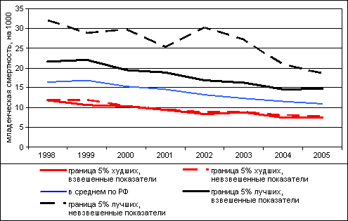 Рисунок 8. Граница значений младенческой смертности в 5% регионов с худшими и с лучшими показателями (невзвешенными и взвешенными на численность населения) наверх Распространенность социальных болезней мало зависит от экономического роста