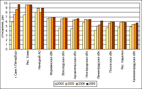 Сокращению бедности препятствует усиление неравенства по доходу, это также следствие экономического роста, вернее, — того типа роста, который сложился в России. На рис. 6 показано квинтильное соотношение доходов (20% населения с самыми высокими денежными доходами к 20% населения с самыми низкими) в Северо-Западном федеральномо округе. Быстрее всего росло неравенство в Санкт-Петербурге, который отличался и самыми высокими темпами роста доходов населения в 2000-е годы. И в подавляющем большинстве регионов страны экономический подъем, особенно в первые годы, усилил концентрацию доходов в более обеспеченных группах населения. Можно сформулировать еще одно общее правило для российских регионов: чем выше уровень доходов их населения, тем выше и неравенство по доходу, особенно в регионах нефтегазодобычи (на Северо-Западе это республика Коми и Ненецкий АО). Как следствие, высокое неравенство по доходу неизбежно замедляет выход из бедности, особенно крайней. Политика борьбы с бедностью оказывается «заложницей» низкого качества экономического роста.