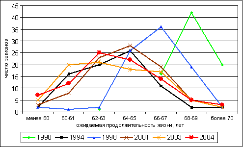 увеличить (48 Кб) Рисунок 2. Индекс развития человеческого потенциала субъектов РФ в 2004 году Во-вторых, экономический рост не влиял на важнейший социально-демографический индикатор — ожидаемую продолжительность жизни населения. Напомним, что рост смертности в начале 1990-х годов во многом стал компенсаций ее сокращения в период антиалкогольной кампании конца 1980-х годов [1]. Во второй половине 1990-х годов региональные показатели ожидаемой продолжительности жизни вернулись к средним за предшествующие десятилетия. Однако в первые пять лет экономического роста (с 1999 по 2003 год) ожидаемая продолжительность жизни в подавляющем большинстве регионов вновь снижалась, и только с 2004 года началось медленное улучшение. Гистограмма распределения регионов все еще слабо отличается от худшего по показателям долголетия 1994 года (рис. 3). Таким образом, восстановительный экономический рост не привел к позитивным изменениям долголетия в подавляющем большинстве регионов, барьером оказался более фундаментальный фактор немодернизированной системы ценностей и образа жизни населения.
