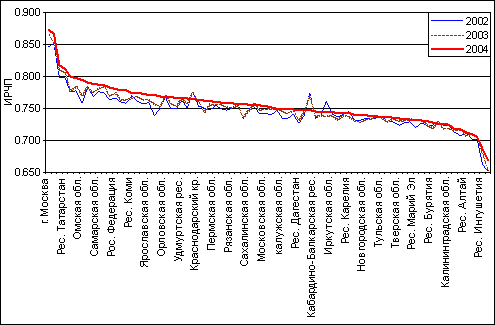 Рисунок 1. Индекс развития человеческого потенциала субъектов РФ в 2002-2004 годах