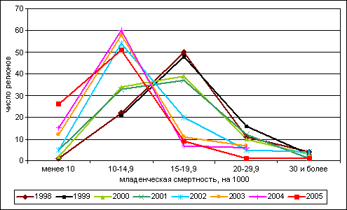 Изменения других социальных индикаторов ЦРТ не столь явно обусловлены краткосрочным экономическим трендом, на них воздействует более сложный комплекс факторов. Так, снижение младенческой смертности началось после 1994 года, когда до подъема экономики было еще далеко. С середины 1990-х годов распределение регионов по уровню младенческой смертности устойчиво сдвигается в сторону более низких значений (рис. 7). Этот индикатор ЦРТ показывает важную особенность социальных трансформаций в России — устойчивое улучшение достигается в том случае, если начавшиеся изменения поведения населения дополняются усилиями государства. Сокращение рождаемости в 1990-е годы сопровождалось более осознанным планированием семьи, снижение нагрузки на роддома позволило уделять больше внимания роженицам, а в последние годы и государство стало вкладывать больше средств в диагностику и родовспоможение. В результате совпадение интересов граждан и государства дало мультипликативный эффект, но при этом экономический рост оказался не исходным «толчком», а поддерживающим фактором.