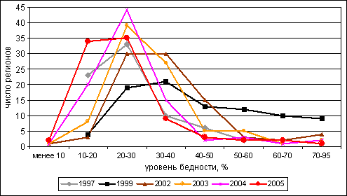 Позитивное влияние экономического роста на снижение уровня бедности (доли населения с доходами ниже прожиточного минимума) очевидно. За 1999-2005 годы он снизился почти вдвое, существенно улучшилось распределение регионов по уровню бедности: в 2005 году в 40% регионов к бедным относилось менее 1/5 населения, а в 1999 году таких регионов было всего 4% (рис. 5). Заметное снижение уровня бедности в 2005 году произошло не только благодаря экономическому росту, повлияли и масштабные выплаты из федерального бюджета с целью снятия социальной напряженности в ходе монетизации льгот. Еще один важный момент — несовпадение скорости восстановления доходов населения и сокращения уровня бедности после финансового кризиса 1998 года. Распределение регионов по уровню бедности только в 2005 году стало лучшим по сравнению с додефолтным 1997 годом, а душевые доходы населения, по данным правительства РФ, достигли уровня 1997 года к концу 2002 года (это подтверждают и наши расчеты распределения регионов). Следовательно, плоды экономического роста получали в основном более обеспеченные группы населения, а бедным доставались крошки от этого пирога.