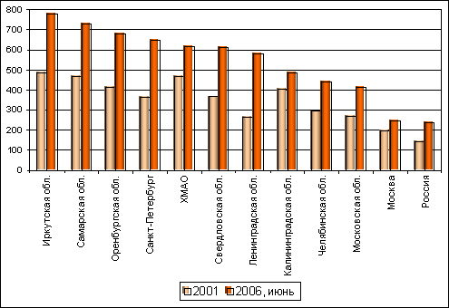 Рисунок 9. Заболеваемость и смертность от туберкулеза по федеральным округам, на 100 тысяч населения Региональная картина инфицированности ВИЧ/СПИД показывает обратную зависимость от уровня экономического развития: вирус иммунодефицита наиболее распространен в богатых регионах, особенно на ресурсодобывающих территориях без развитой социальной среды. Он тесно связан с распространением наркотиков. Налицо проблема «потерянного» поколения — молодежи из небедных семей, но без развитых интересов и потребностей, поэтому высокие доходы далеко не всегда направляются на развитие человеческого потенциала. Надежд на улучшение ситуации пока мало, темпы роста численности инфицированных ВИЧ/СПИД остаются высокими. Только в трех субъектах РФ — федеральной столице, Ханты-Мансийском АО и Калининградской области — они заметно снизились (рис. 10). Это следствие не только активной политики борьбы со СПИДом, проводимой региональными властями, но и естественных причин — более раннего начала эпидемии.