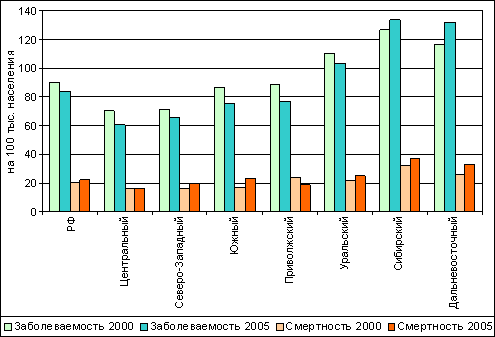 Динамика социальных болезней демонстрирует слабую зависимость от экономического роста. Заболеваемость туберкулезом (по впервые выявленным случаям) начала снижаться только в тех федеральных округах, где эта проблема менее остра (рис. 9). В Сибири и на Дальнем Востоке, где уровень заболеваемости максимален, показатели продолжают расти. Возможности здравоохранения влиять на улучшение показателей весьма ограничены, если деградирует вся социальная среда — на востоке страны выше уровень бедности, маргинализации и концентрации пенитенциарных заведений, и все это дополняется неблагоприятными климатическими условиями. В России пока «лечатся» только не самые запущенные случаи, а в тех регионах, где показатели экстремально плохие, ничего не получается — не хватает ресурсов, чтобы преодолеть влияние множества негативных факторов развития. Этот вывод подтверждают показатели смертности от туберкулеза, которые растут почти повсеместно, в том числе из-за преобладания маргиналов среди больных с запущенными формами туберкулеза.