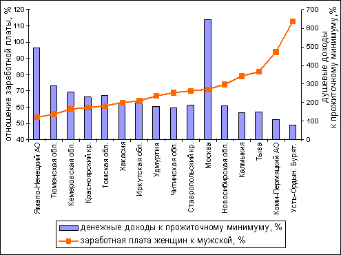 Для регионов России не характерны проблемы гендерного неравенства, на преодоление которых нацелены индикаторы ЦРТ: диспаритет в несельскохозяйственной занятости и доступности образования для женщин. Реальная гендерная проблема России — значительное отставание средней заработной платы женщин, она составляет 60% от заработной платы мужчин. Региональный же срез этой проблемы таков: чем выше денежные доходы в регионе, тем выше неравенство между заработной платой женщин и мужчин; и наоборот, в регионах с низкими доходами неравенство минимально, а порой заработки женщин даже выше (рис. 11). Получается, что гендерное выравнивание доходов у нас возможно лишь в бедности. Из общего тренда выбивается только Москва, где более развитый сектор рыночных услуг дает возможность женщинам с высокой квалификацией найти высокооплачиваемые рабочие места. За годы экономического роста гендерное соотношение заработков практически не менялось: сырьевая структура экономики России и экспортно-ресурсный тип роста не способствуют гендерному выравниванию.