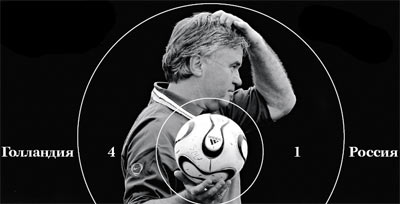 А в целом проигрыш тот — в ожидании скорого светлого будущего — восприняли более чем спокойно. Вячеслав Иванович Колосков, сдавая пост главы Российского футбольного союза, дал достойный прощальный банкет. Виталий Леонтьевич Мутко если и проставлялся по поводу своего всеми прогнозируемого назначения, то только в узком кругу. Болевые точки горемычного российского футбола обозначил сразу — поля и тренеры. Дороги, в общем, и дураки. Первые надо строить — с помощью Национальной академии футбола, структуры Романа Абрамовича, вторых нанимать из иностранцев — на деньги того же Абрамовича. Но поскольку все серьезные, реально практикующие (на пенсионерах к тому времени успели уже обжечься небедные клубы) иностранцы на момент восхождения г-на Мутко на трон были гдето заняты. Брешь в последний раз попытались закрыть своей грудью. У Юрия Семина для попадания в Германию она оказалась не слишком широка. Купили Хиддинка (4 миллиона евро на два года), резво начали насаждать поля в регионах — жизнь вот-вот должна была наладиться. Но голландец оказался (вдруг!) куда более самостоятельным, чем его хотели бы видеть номинальные начальники. Жить предпочитал в родной стране, бывая в России короткими наездами, матчи с участием кандидатов смотрел куда чаще на видео, чем вживую, и главное ведь — постоянно отказывался посидеть по-человечески: выпить, закусить, поговорить за жизнь, футбол и дружбу. Ну просто стену вокруг себя возвел. А тут еще и проблемы налоговые у него обнаружились — полное право имел человек еще большую дистанцию держать. Правда, Хиддинк этот сразу сказал, что приехал к нам не навсегда, но помощников возьмет русских, молодых и перспективных — будете потом долго еще добрым словом меня вспоминать. И — взял. С ходу у них у всех (см. выше Липпи) получаться понятно, что не все стало, но к ноябрю уже вроде выправились. В Македонии не просто уже выигрывали, но было видно, что играли так, как Хиддинк и хочет. И вот — первый выход после зимней паузы. И будто Хиддинку со помощники в подарок придумали Кубок Первого канала. В Израиле, в футбольную погоду, на тех полях, какие долго еще до всех наших регионов не дойдут. Тем паче что в составе ЦСКА со «Спартаком» 9 (девять) человек играют, кого сам Гус в сборную и вызвал. Но какой-то враг российского футбола именно на ранний февраль присылает Хиддинку повестку в суд — идти отбивать свои полтора миллиона евро, якобы недоплаченных налогами в 2000—2004 годах. До поездки ли тут в Израиль? Но не вопрос — молодые помощники, они же на подъем самые скорые! Амстердам, два дня до игры. — Почему никто из ваших помощников так и не появился в Израиле? — У меня была четкая договоренность, что наш наблюдатель там обязательно появится. Но мне объяснили, что возникли технически проблемы с оформлением визы. Все-таки Россия — это очень громоздкая бюрократическая система… При Колоскове ведомство, однако, порасторопнее в таких вещах, помнится, было. Зато какой грандиозный выезд РФС в Голландию организовал — чтобы увидеть, как сначала сгорит молодежная сборная — 0:3, а затем и главная — 1:4. А главное — мысли в игре не прослеживалось, если не считать попыток играть верхом на низкорослых нападающих. Хотя сейчас два года спустя Жирков, наконец-то, голевой пас дал… И Хиддинк, как вполне уже советский тренер, будет говорить, что другого на с