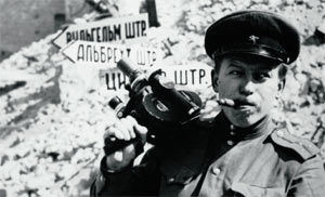 ...А Великую Отечественную войну я встретил на преддипломной практике. По иронии судьбы мы тогда снимали документальный фильм о подготовке к войне, который назывался «Город в обороне». Мы выехали на экспедицию в город Коломну. Первый съемочный день — 22 июня, воскресенье. Мы договорились с руководством города, что они организуют нам учебную тревогу, которую наша группа должна была снимать. Утром мы приготовились к съемке, погода хорошая была, уже из окна гостиницы мы видели, как по улицам Коломны люди с носилками ходят, с повязками красного креста... Но нам сказали из горкома: «Подождите, не выезжайте». И вот мы ждем... уже 9, 10 часов утра... дождались мы до 12 часов, когда по радио Молотов сообщил, что началась война. Мы моментально собрались и вернулись в Москву. Первое, что бросилось в глаза в Москве, — милиционеры, которые регулировали движение, были с противогазами. Это первый признак войны, который у меня в памяти остался. Через три месяца мы были эвакуированы с Московской студией кинохроники через Куйбышев в Алма-Ату. Мы на машине были вместе с оператором Мишей Посельским, с которым мы еще в институте подружились и всю войну вместе прошли. Потом оттуда меня вернули обратно в Москву, а уже из Москвы я был направлен в фронтовую группу Первого Белорусского фронта. Мы все еще считались работниками студии документальных фильмов, но у нас и звания были. Я был капитаном, но из оружия нам выдавали только пистолеты. На весь фронт у нас была группа около 11 человек кинооператоров. Никакой цензуры на фронте не было. Вся цензура в Москве начиналась: они смотрели все и, конечно, что-то вырезали. Но мы об этом ничего не знали и снимали все подряд. Но мы понимали, что необходим был патриотический материал, который поднимал дух не только на фронте, но и в тылу. Это была самоцензура.