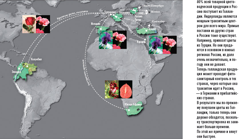 80% всей товарной цветоводческой продукции в Россию поступает из Голландии. Нидерланды являются мощным транзитным центром для всего мира. Прямые поставки из других стран в Россию тоже существуют. Например, привозят цветы из Турции. Но они продаются в основном в южных регионах России, их доля очень незначительна, и погоду они не делают. Теперь голландская продукция может проходит фитосанитарный контроль в тех странах, через которые она транзитом идет в Россию, — в Германии и прибалтийских странах. В результате мы по-прежнему покупаем цветы из Голландии, только теперь они дороже обходятся, поскольку транспортировка их занимает больше времени. По этой же причине и вянут они быстрее.