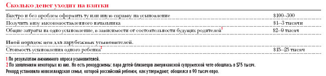 Несколько лет назад московская семья, не имев шая по медицинским показателям возможнос ти иметь семью, попыталась усыновить ре бенка. За несколько месяцев подвижек достичь не удалось — под разными предлогами органы опеки отклоняли просьбу супружеской четы. В конце концов жена решилась на операцию с «ложной беременностью». Чтобы заплатить отступные настоящей матери, а также оплатить оформление необходимых докумен тов врачами и социальными органами, семья была вынуждена продать четырехкомнатную квартиру и купить двухкомнатную.