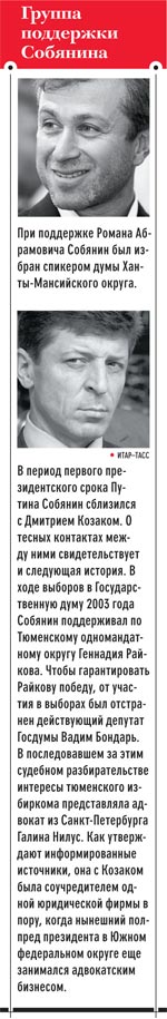 На «реформаторской» почве Собянин сблизился с очень влиятельным в Кремле в период первого президентского срока Путина Дмитрием Козаком. О тесных контактах между ними свидетельствует и следующая история. В ходе выборов в Государственную думу 2003 года Собянин поддерживал по Тюменскому одномандатному округу Геннадия Райкова. Чтобы гарантировать Райкову победу, от участия в выборах был отстранен действующий депутат Госдумы Вадим Бондарь. В последовавшем за этим судебном разбирательстве интересы тюменского избиркома представляла адвокат из Санкт-Петербурга Галина Нилус. Как утверждают информированные источники, она с Козаком была соучредителем одной юридической фирмы в пору, когда нынешний полпред президента в Южном федеральном округе еще занимался адвокатским бизнесом.