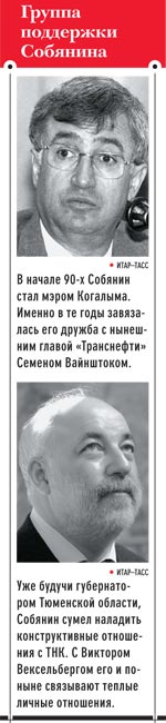 Градообразующее предприятие Когалыма — «Когалымнефтегаз» — было одним из наиболее ценных активов тогда еще только выстраиваемой компании «ЛУКОЙЛ». По неписаному правилу мэры таких городов по служебной обязанности всегда присутствуют на «лукойловских» планерках. Должность главы одной из нефтегазовых «столиц» России в 90-е годы была не из самых безопасных. Достаточно вспомнить судьбу мэра Нефтеюганска Петухова, застреленного средь бела дня. Собянин сумел найти стратегически правильную линию поведения: с «ЛУКОЙЛом» он никогда не ссорился, но при этом, по многим свидетельствам, старался благоустроить город как мог. Именно в те годы завязалась его дружба с нынешним главой «Транснефти» Семеном Вайнштоком1. Дружил Собянин не только с «ЛУКОЙЛом». Впоследствии, уже будучи губернатором Тюменской области, он сумел наладить конструктивные отношения с ТНК. С Виктором Вексельбергом его и поныне связывают теплые личные отношения. Как и с Романом Абрамовичем: при его поддержке Собянин был избран спикером думы Ханты-Мансийского округа.
