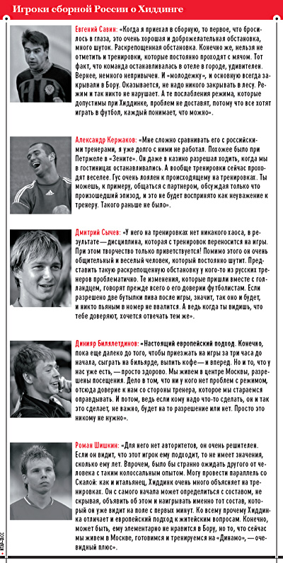«Очень важно, чтобы исполнители, которые у нас есть, учились играть в более быстром темпе. Так появится жесткость. Когда я пришел, мне казалось, они думают, что у меня в руках волшебная палочка. Но у меня ее нет, ее нет ни у кого. Россия не зря стоит в конце третьего десятка в рейтинге ФИФА. Против Израиля мы, к сожалению, допустили ничью, иначе поднялись бы в группе. Но разочаровываться рано. Самое важное — заниматься футболом структурно. Даже президент Путин в прессе сказал, что в последние годы отставание усилилось. Это хорошая поддержка с его стороны. Я не представляю, чтобы Балкененде (премьерминистр Голландии. — The New Times) сделал то же самое».