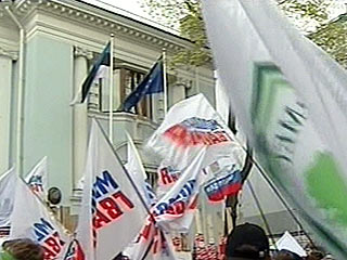 Активист молодежного движения "Наши" сорвал флаг эстонского государства с флагштока у посольства Эстонии в Москве во вторник. Молодого человека, а также еще троих активистов, задержали бойцы ОМОН, передает "Интерфакс". Толпа пикетчиков окружила машину сотрудников милиции, в которой находились задержанные, и долго не давала машине выехать с территории, прилегающей к зданию посольства.