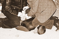 "Аноним, 28.04.2007 г.: "Был вчера взят полицией при возвращении домой. Отметелили дубинками, прокатили мордой об асфальт, заломали руки и отвезли в D-терминал, в барак с 300 или более людьми. Больше половины из них - совершенно порядочные люди! При отекших коленках многие не могли долго сидеть на корточках и вставали. Их тут же сбивали с ног и показательно избивали. Все были просто в шоке и освистывали происходящее. Там было много и эстонцев, которых били похлеще нашего брата. Одному все лицо разбили в кровь, хотя он агрессии не проявлял. Было несколько иностранцев из Дании или Германии, одному за 60. Он просил объяснить его права и за что его избили двое сотрудников полиции. Ему на глазах у всех разбили об стену голову, после дубинками добивали. Помочь никто не мог, так как руки у всех стянуты, порой до охлаждения конечностей, пластиковыми ремнями. Только возгласы недоумения и просьбы не трогать старика звучали со всех сторон. После его снова увели в глубь казармы и там разорвали демонстративно ему одежду. Мне показалось, что ему что-то вкололи. После этого он перестал вообще издавать какие-либо звуки.