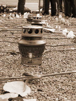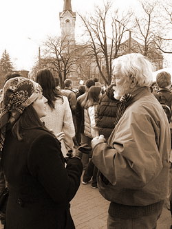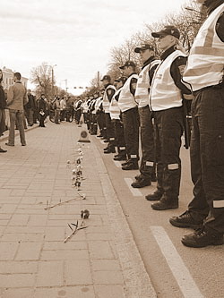 Drive Alienn, 28.04.2007 г.: "Митинг начинался мирно. С утра полиция перекрыла подступы к Солдату, и со временем к оградам начали стягиваться митингующие. Что это были за люди? По большей части взрослые и серьезные, то есть те, кому действительно не безразлична память о Солдате, те, кто в силу определенных убеждений не согласны с тем, чтобы Солдат стоял в другом месте. Почему эти люди не хотят, чтобы Солдат и захоронения погибших покоились не на автобусной остановке, а на Военном кладбище? Этого я не знаю. Я-то по глупости считаю, что память к жертвам против фашизма, эта память - везде. Где бы то ни было…Взрослый народ ведет себя взросло и достойно. Поэтому дневной митинг обошелся без эксцессов. Люди втыкали гвоздики в забор, раскладывали их по асфальту - мило и оригинально. Выходит некий крик о помощи. Отчаяние без границ. Но цветы полиция зачем-то выдергивала. К чему? Для чего? Мешают, что ли? Мгновенно подбегали ОРТ и РТР, и снимали плачущих женщин, рассказывающих, как полиция выдергивает гвоздики. Отлично! Выйдет замечательный репортаж!..