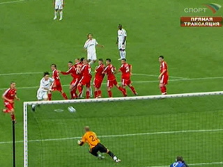 На последней минуте первого тайма "Милан" получил право на штрафной удар в опасной близости от ворот англичан. Андреа Пирло великолепно пробил в обвод стенки. Голкипер мерсисайдцев Пепе Рейна контролировал ситуацию до тех пор, пока на траектории полета мяча как чертик из табакерки не возник Филиппо Индзаги. Снаряд срикошетил от его плеча и влетел в незащищенный угол ворот.