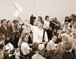 – Дай мне-то листовку! Че ты туда-то кидаешь?! (Юноша, стоя лицом к президенту, кидал листовки себе за спину.– Прим. А. Колесникова.) Ну дай мне, дай! Че ты?!