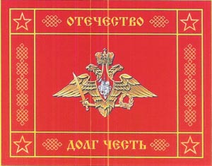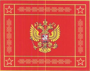 Но это цветочки, нынешнее знамя Вооруженных сил Российской Федерации — вот ягодка! Сами армейцы без затей и почтения именуют его «половым ковриком», «плюшевой скатертью», да еще и сравнили с этикеткой многозвездного армянского коньяка. И, надо признать, иных мыслей при виде этого творения неизвестных ремесленников просто не возникает. Общий дизайн чуда откровенно слизан со знамен-хоругвей Александра III, но окрас чисто советский. А уж символика — полный сюр: красное полотнище, в центре лицевой стороны которого золотой двуглавый орел Александра III, на оборотной стороне орел Николая I, а в каждом углу обеих сторон полотнища — красная пятиконечная звезда. Да еще на знамени богатый плетеный орнамент. На оборотной стороне в него вплетены надписи, стилизованные под старославянский шрифт: «Отечество», «Долг», «Честь».