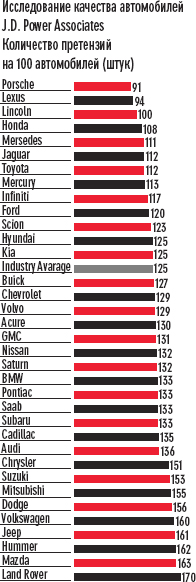 Относительность оценок подчеркивает одно забавное обстоятельство. В исследовании J.D. Power отмечалось не только качество тех или иных автомобилей, но и работа автомобильных заводов. Одним из лучших признали фордовское предприятие в городе Уиксом (штат Мичиган), которое выпускало Lincoln Town Car. Его-то недавно и закрыли в рамках «финансового оздоровления» Ford, умудрившегося набрать долгов на $18 млрд. В рейтингах J.D. Power пять фордовских моделей признаны «самыми качественными» в своих классах, в то время как Меrcedes и Toyota победили лишь в трех номинациях .