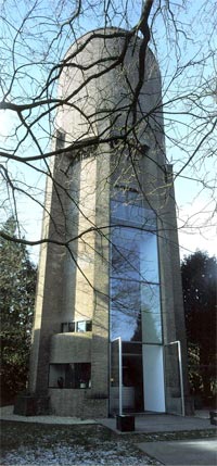 Спиральная лестница пронизывает все этажи здания. Интерьеры выдержаны в хай-тек дизайне, местами на поверхность выходят технологические элементы старой водонапорной башни.