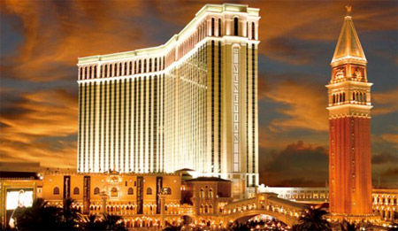 Роскошный развлекательный мега-комплекс, выполненный в "венецианском стиле", включает в себя сорокаэтажную гостиницу на 3 тысячи номеров, гигантский торговый центр, выставочный павильон площадью 111 тысяч кв. метров, арену с трибунами на 15 тысяч зрителей. Для сравнения подсчитано, что на всей этой территории могли бы уместиться 90 авиалайнеров Boeing-747.