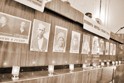 Оформление лицевой панели стола президиума с надписью «Псковичи – жертвы политических репрессий» выглядело двусмысленно, но более доступного места для размещения фотографий убитых в годы репрессий жителей города, очевидно, не нашлось. Картина, нет слов, получилась символическая – фотографии погибших оказались визуально существенно ниже здравствующих персон, при всем к ним уважении.