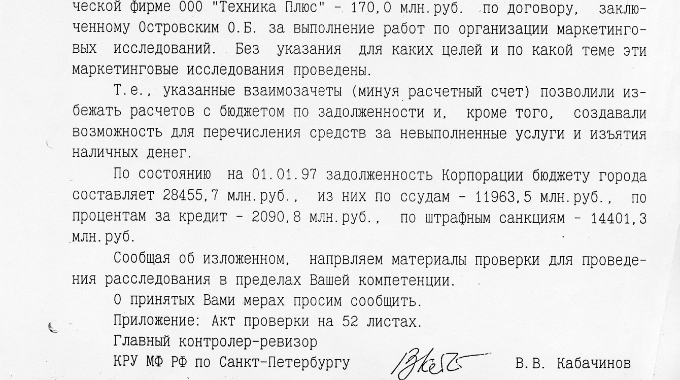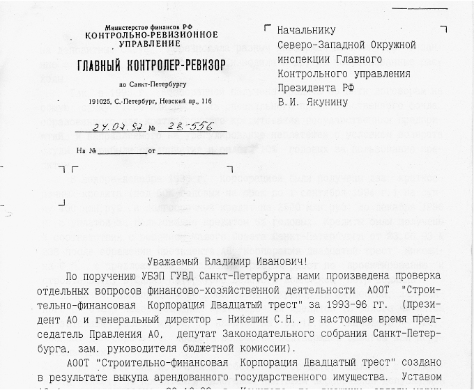 В июле 1997 года на стол руководителя Северо-Западной окружной инспекции Главного контрольного управления администрации президента РФ Владимира Якунина легла докладная записка от главного контролера-ревизора Контрольно-ревизионного управления Министерства финансов В.В. Кабачинова. На восьми страницах ревизор подробно перечислял не слишком сообразующиеся с законом операции знаменитого «Двадцатого треста», к финансовым успехам которого были непосредственно причастны заместитель мэра Санкт-Петербурга Владимир Путин и его подчиненный Дмитрий Медведев. В конце ревизорской справки указывалось, что строительно-финансовая корпорация «Двадцатый трест» задолжала бюджету Санкт-Петербурга сумму в 28 миллиардов 455 миллионов 700 тысяч рублей.