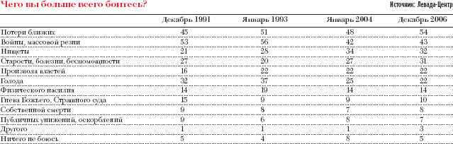 С 53 до 43% (в 1991 и 2006 годах соответственно) сократилось число тех, кто опасается войны или массовой резни. По мнению социологов, это легко объяснимо тем, что советская идеология постоянно убеждала граждан в существовании угрозы агрессии со стороны вражеских государств. «Советские люди почти все время жили в этом страхе, — говорит социолог Левада-Центра. — Страх постепенно начинает уходить, но процесс слишком долгий, потребуется смена нескольких поколений, а не просто уход тех, кто еще помнит Вторую мировую». На фоне ослабевания страха войны заметно возрос страх нищеты, прибавивший целых 11%1. Также возросла боязнь старости и беспомощности2. Лев Гудков уверен: «Оба страха имеют исключительно социальную природу — у людей нет надежды на институты, которые могли бы обеспечить нормальные условия жизни». Однако на этом фоне заметно уменьшился страх голода — с 32 до 22%, что является результатом адаптации населения к изменившимся после распада СССР условиям жизни. Как 15 лет назад, так и сейчас эти три страха наиболее актуальны для людей наименее обеспеченных и пожилых.