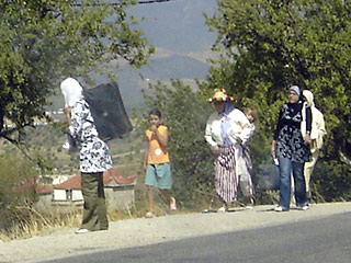 Незнакомка с девочкой на спине двигается по обочине шоссе вместе со своими спутниками. Одна из женщин несет синюю сумку средних размеров с вещами.