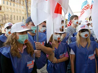 Группа молодежи со знаменами движения "Молодая гвардия" пикетирует во воскресенье здание концертного зала "Измайлово", где должен состояться федеральный съезд коалиции "Другая Россия".