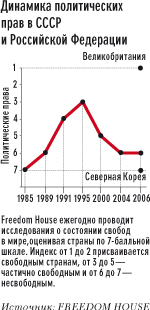 Почему же эксперты оценили Россию столь низко по итогам 2006 года? Список претензий длинен: подавление протестной активности, схлопывание деятельности неправительственных организаций, контроль чиновников за правозащитниками, закон об экстремизме, преследования по этническому признаку (в частности, депортация грузин), убийство Анны Политковской. Плюс изменение электорального законодательства, которое, по сути, превратило выборы в фарс. В выборы без реального выбора. И об этом — в главной теме номера на странице 08.