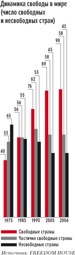 Но глобальный тренд, исчисляемый уже тридцатью годами, очевиден: если в 1975 году в мире было лишь 40 стран, относимых к числу свободных, то в 2006-м — уже 90. Если в 1992 году 1 миллион 352 тысячи (24,8% населения планеты) обладали тем, что дано человеку по рождению, — свободой выбора, то в 2006-м таких стран уже 90 и уже более 3 миллионов человек (46%) — пусть и с известными допусками — живут в условиях свободы. А нас там нет. Мы среди тех 37% (2 миллиона 448 тысяч человек) населения Земли, кому свобода оказалась не по плечу.