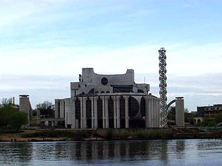 Примерно 40-метровая стела была сложена из пустотелых железобетонных модульных конструкций, из которых сделан потолок театра драмы.