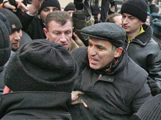 На Мясницкой был задержан правозащитник Лев Пономарев. Один из бойцов схватил его за шею, еще двое потащили в автобус. Лидер ОГФ Гарри Каспаров стоял в плотном окружении охраны и журналистов. "Задержать Каспарова!" - раздалось из рации одного из омоновцев, и около десятка бойцов клином вошло в эту толпу. "Имейте уважение, он же шахматист, чемпион!" - кричала на милиционеров пенсионерка Елена Сусляева. Лидера ОГФ выхватили из толпы и еще пару сотен метров тащили к автозаку. Позже господин Каспаров получил пять суток ареста за сопротивление милиции. Всего же в ходе марша было задержано несколько десятков человек.