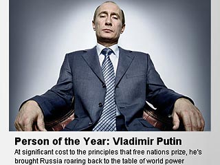 Американский журнал Time назвал президента Владимира Путина человеком 2007 года. Таким образом, российский лидер обошел прочих претендентов: вице-президента США Альберта Гора и Джоан Роулинг - создательницу бестселлеров про Гарри Поттера. По словам управляющего директора Time Ричарда Стенгела, которого цитирует ИТАР-ТАСС, на посту президента Владимир Путин "проявил необыкновенные лидерские качества, он получил страну, находившуюся в состоянии хаоса, и привел ее к стабильности".