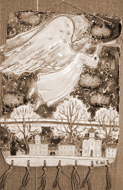 Если только перечислять сюжеты её панно, то звучит это весьма прозаично: натюрморты, цветы, ангелы, бабочки, пейзажи, птицы… Но перед её улиткой в стиле модерн застываешь, напрочь забыв о сюжете. А вертикальные «Маки» - это цветовая музыка, уносящая зрителя в жаркое лето. Такой глубины цвета мы еще не видели ни у кого.