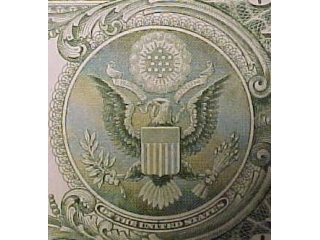 Дело в том, что Большая Печать США, она же являющаяся гербом страны, стоит на оборотной стороне однодолларовой банкноты. Это распростерший свои крылья белоголовый орлан, прикрытый щитом, который украшен узором звездно-полосатого флага. В одной лапе орлан держит оливковую ветвь, символизирующую мир, с 13-ю листьями и 13-ю оливковыми плодами (по числу первых 13 американских штатов, объединившихся в одно государство), в другой - 13 стрел, символизирующих готовность страны в случае необходимости вступить в войну.