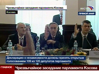 "Документ уже подписан главой Косово и мною, премьер-министром Косово. Глава парламента Косово созвал экстренное заседание парламента для обсуждения вопроса о независимости Косово, которое начнется в двенадцать часов. Речь идет о провозглашении независимости Косови и обсуждении символов государственной власти", - отметил Тачи.